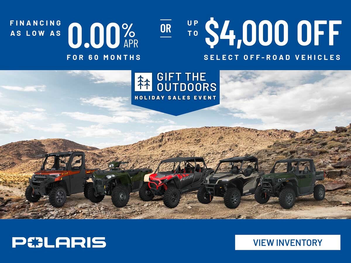0.00% for 60 Months offer in lieu of rebate and only available on select 2025 GENERAL Models purchased prior to 12/31/2025. Youth Models excluded. On a purchase where the Amount Financed is $7,500.00, your Down Payment is $0.00 with 60 monthly payments of $125.00 each. Subject to credit approval. Rebates available on select new and unregistered 2024 - 2025 Sportsman, Scrambler, RANGER, RZR, GENERAL and Polaris XPEDITION models purchased between 11/1/2025 - 12/31/2025. Prices exclude tax, tag, title, dealer fee and dealer added options and accessories.
